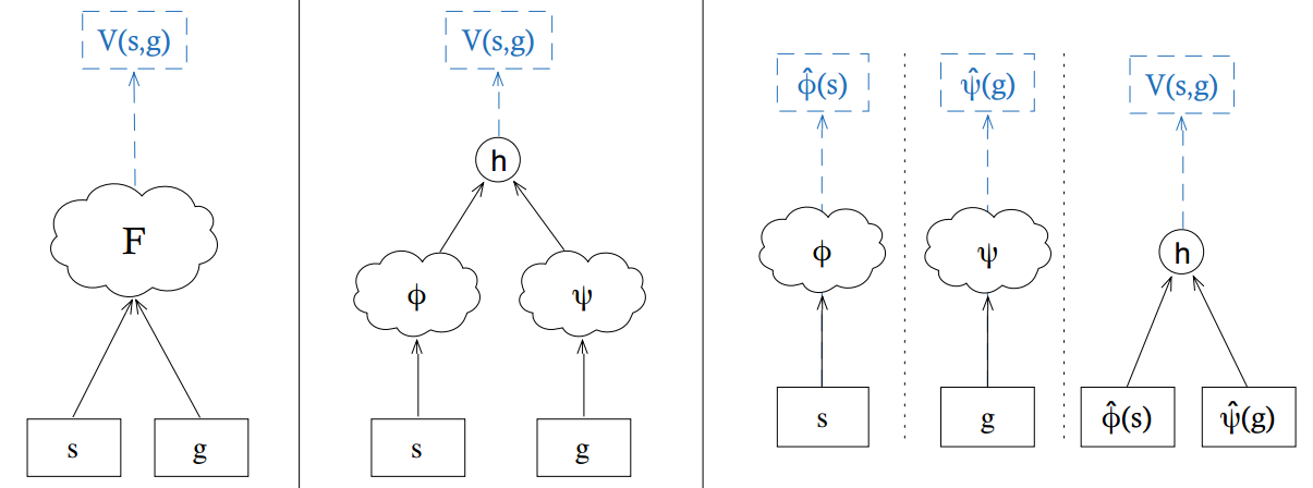 嵌入向量在UVFA中的应用被称为因子分解。原始的UVFA合并状态sss和目标ggg输入到网络FFF计算V(s,g)V(s,g)V(s,g),而因子分解先用两个独立子网络ϕ\phiϕ和ψ\psiψ的双流架构学习状态sss到状态嵌入ϕ(s)\phi(s)ϕ(s)和目标ggg到目标嵌入ψ(g)\psi(g)ψ(g)的映射,再将二者合并输入到网络hhh计算V(s,g)V(s,g)V(s,g)。嵌入网络跟随整个价值估计任务一同进行端到端的训练。论文中采用了数据矩阵的低秩分解得到嵌入向量的标签值,但这涉及矩阵分解理论,且与端到端训练效果等价,故本文不作探讨。