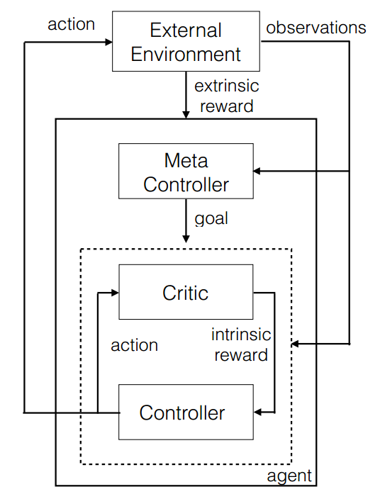 h-DQN(Hierarchical Deep Q-Network,分层深度Q网络)将UVFA的核心思想与分层强化学习相结合,设计出了元控制器-控制器双层架构。