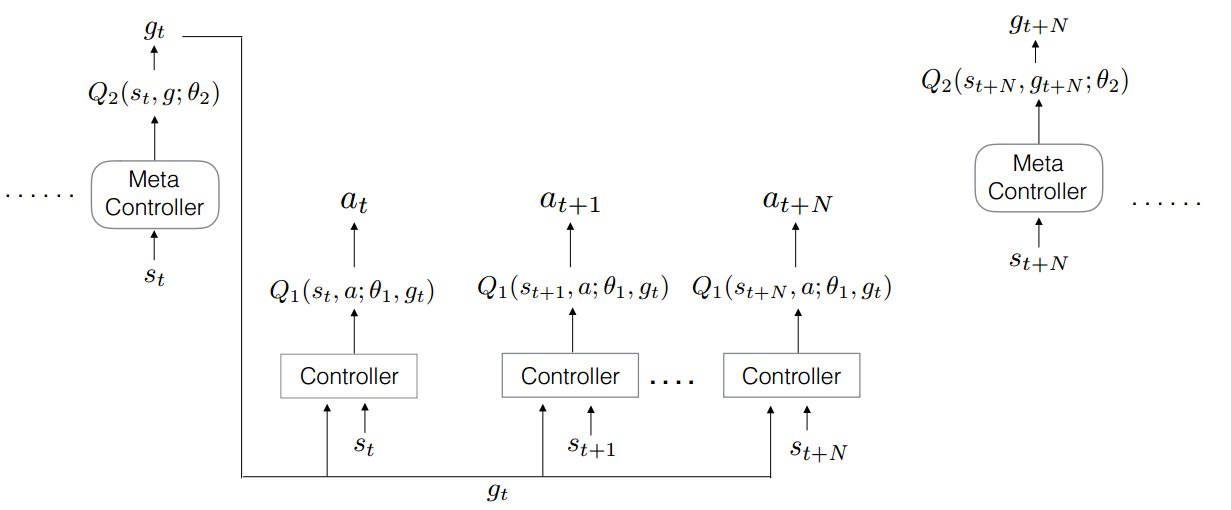 总目标即由元控制器从环境奖励中学习,由此元控制器的估计目标形式即为一般的动作价值函数,只是子目标ggg替换了动作aaa