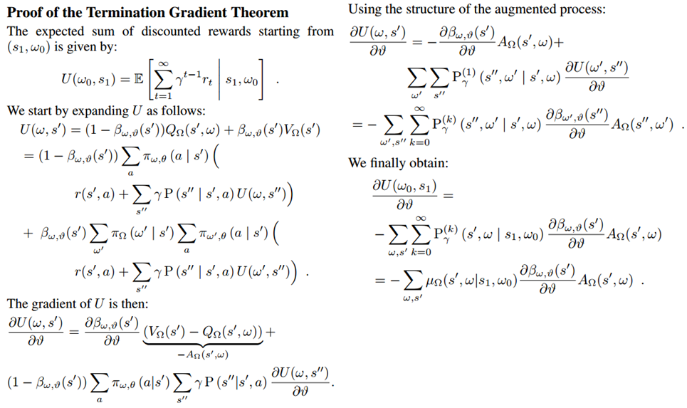 最后,由于选项是否终止这一因素的存在,OC定义了MDP在包含选项空间 Ω \Omega Ω的增强状态空间 S × Ω \mathcal S\times\Omega S×Ω下的转移概率,这将用于在梯度定理的推导中得到更简洁的形式
