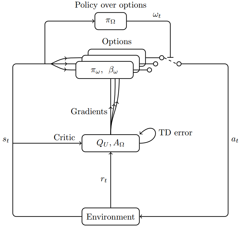 Option-Critic(选项-评论家,本文简称OC)架构以Actor-Critic架构为基础,采用了选项框架来封装子任务,其设计目的是将选项内化为可学习的部件。回顾一下,在选项框架中,一个选项 ω ∈ Ω \omega\in\Omega ω∈Ω由三元组 ( I ω , π ω , β ω ) (\mathcal I_\omega,\pi_\omega,\beta_\omega) (Iω,πω,βω)描述: