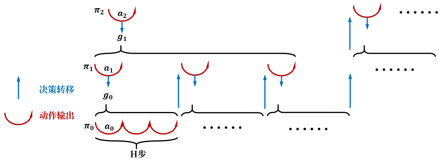 - 低层策略πi−1\pi_{i-1}πi−1根据目标gi−1g_{i-1}gi−1和状态si−1s_{i-1}si−1,输出动作ai−1a_{i-1}ai−1;