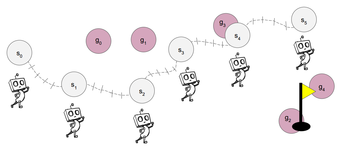 在状态s0s_0s0,高层策略π1\pi_1π1给出目标g0g_0g0,低层策略π0\pi_0π0执行H=5H=5H=5步后到达s1s_1s1,再由高层策略π1\pi_1π1给出目标g1g_1g1,以此类推。一次状态转移TTT产生的经验是由转移前状态sss、输出动作aaa、转移结束时状态s′s's′、来自高层的目标ggg和未来价值折扣率γ\gammaγ组成的五元组(s,a,s′,g,γ)(s,a,s',g,\gamma)(s,a,s′,g,γ)。。以g0g_0g0产生的状态转移为例,高层策略π1\pi_1π1收集的经验为(s0,a=g0,r,s′=s1,gtotal=黄旗,γ)(s_0,a=g_0,r,s'=s_1,g_{total}=黄旗,\gamma)(s0,a=g0,r,s′=s1,gtotal=黄旗,γ)。