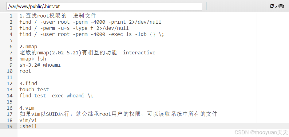 连接蚁剑成功后,查找到网址根目录下有.hint.txt文件,查看内容是关于提权相关知识点,具体如下所示。