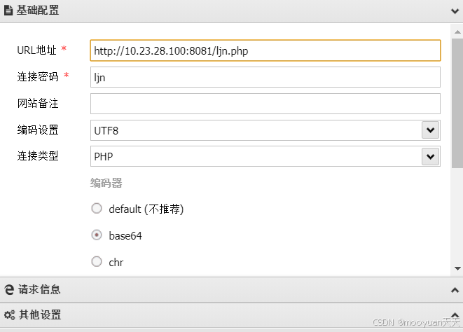 蚁剑的URL链接为http://10.23.28.100:8081/ljn.php,密码为ljn,添加连接成功如下所示。