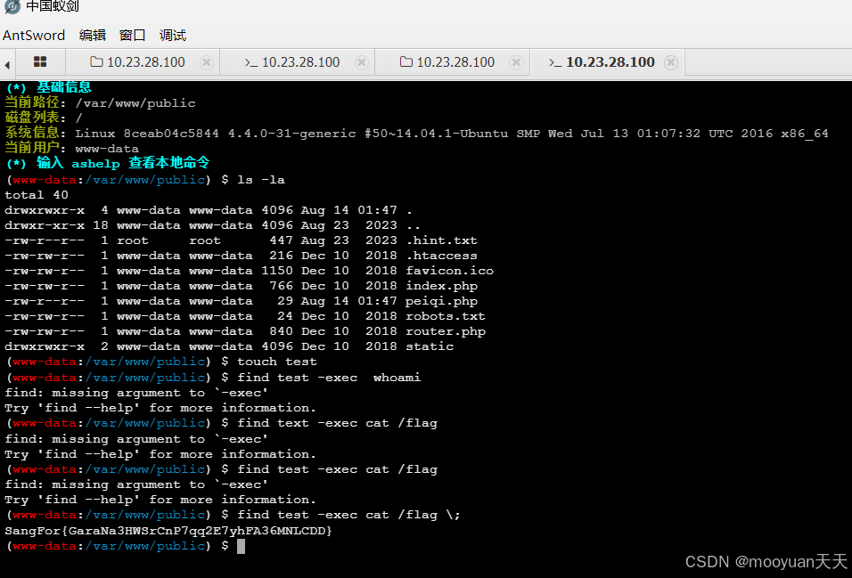 使用find提权,使可以查看根目录下的flag文件。find命令本身是用于查找文件的工具,但如果它被设置了 SUID 权限,则普通用户执行find时会以文件所有者(通常是 root)的权限运行。此时,通过-exec参数可以执行系统命令,从而实现提权操作,具体命令如下所示。