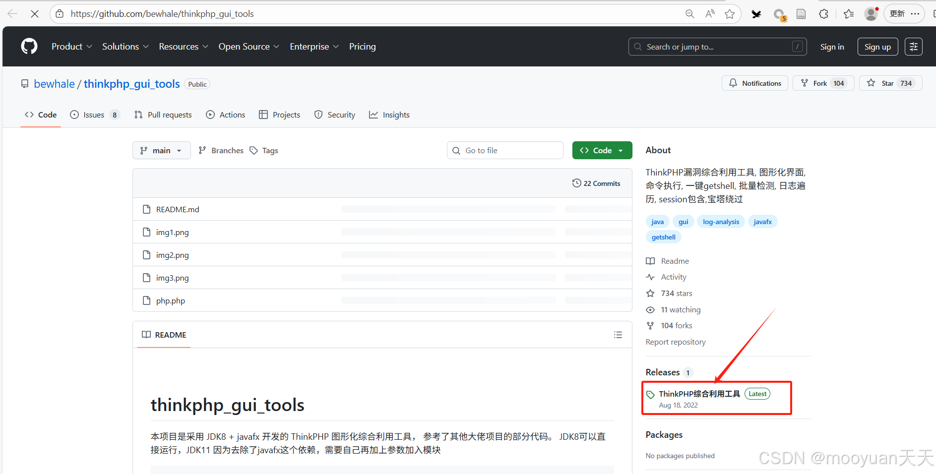thinkphp_gui_tools 是一个采用 JDK8 + javafx 开发的 ThinkPHP 图形化综合利用工具,其下载地址如下URL所示,选择Release版本进行下载,如下图红框所示。