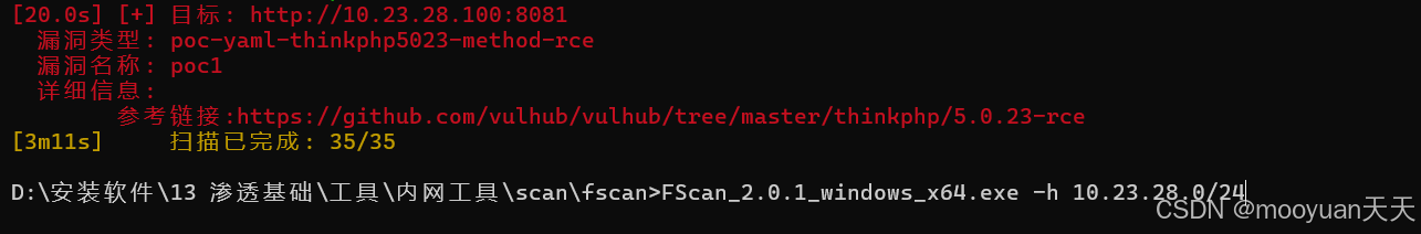 使用fscan -h 10.23.28.0/24扫描10.23.28.0网段,发现10.23.28.100:8001由thinkphp 5.23的RCE远程执行漏洞,效果如下所示。