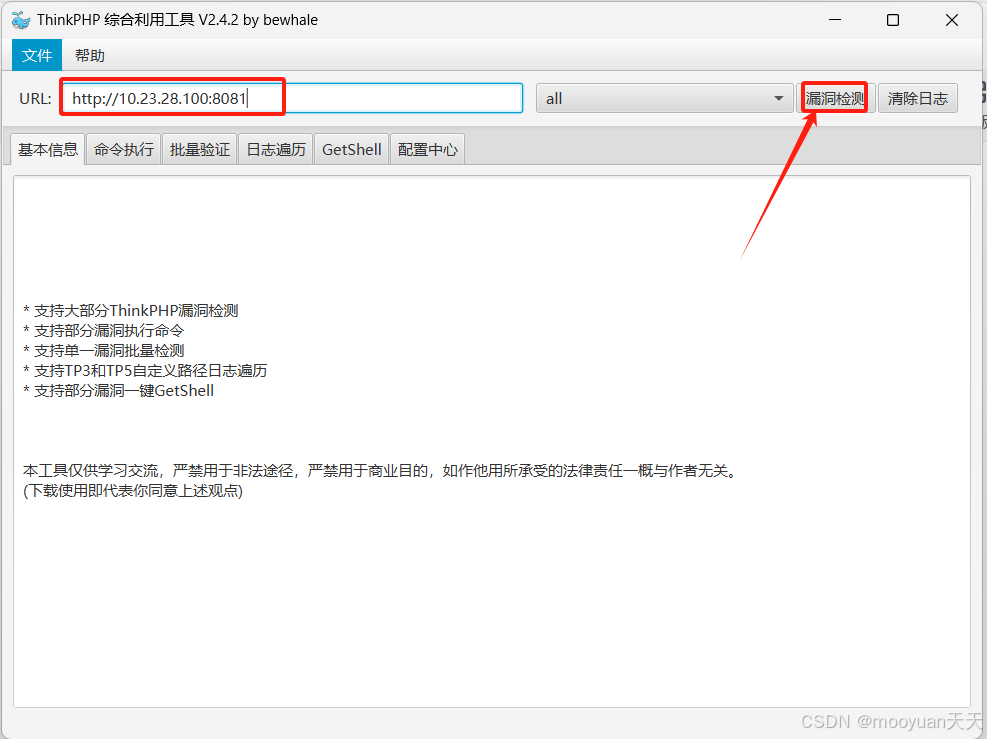 执行java -jar ThinkPHP.jar后即可启动thinkphp综合利用工具,如下图所示,URL地址填写thinkphp的主页,即http://10.23.28.100:8081,然后点击漏洞检测。