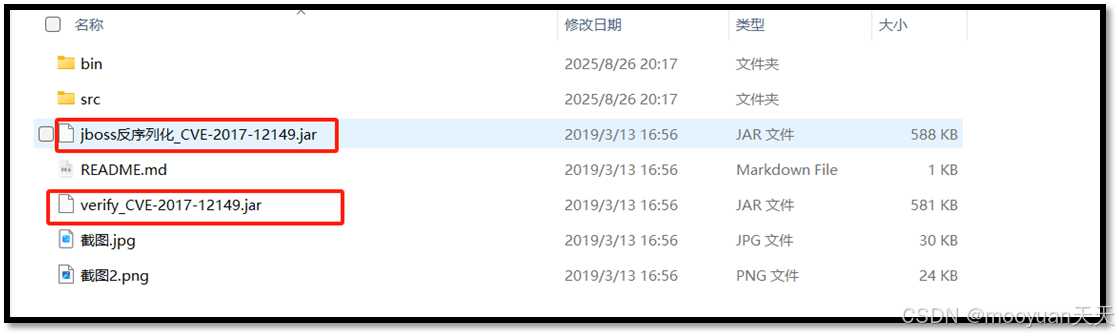 解压后文件夹内容如下所示,其中jboss反序列化_CVE-2017-12149.jar为攻击脚本、verify_CVE-2017-12149.jar为探测脚本。