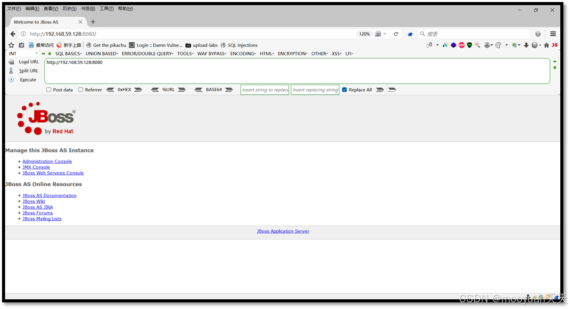 浏览器访问 Vulhub 提供的漏洞网站http://[目标机IP]:[端口] ,以本机为例,ip地址为192.168.59.128,端口号为8080, 故而访问http://192.168.59.128:8080即可进入Jboss渗透环境,这个页面就是我们的攻击入口,如下所示。