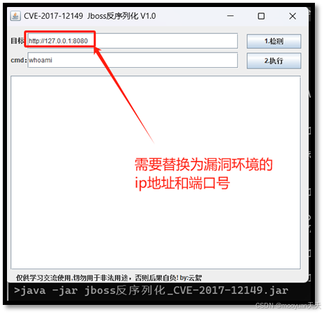 命令行种使用java -jar jboss反序列化_CVE-2017-12149.jar启动攻击工具,如下所示。