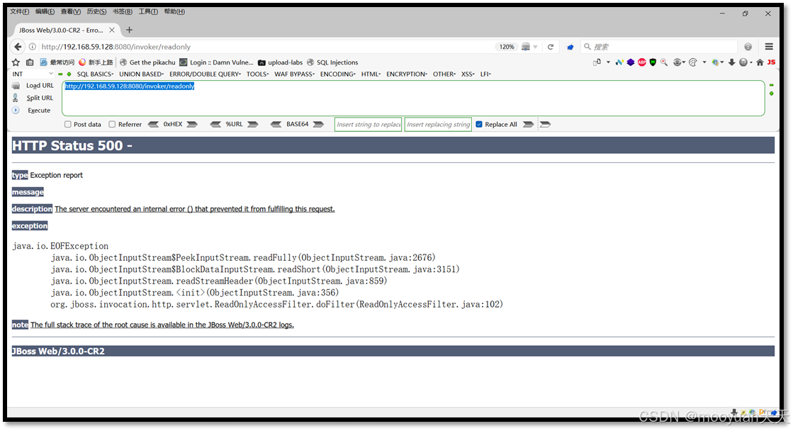 以本机为例,访问http://192.168.59.128:8080/invoker/readonly,目标服务器响应如下500的页面,则基本可以判目标服务器存在CVE-2017-12149漏洞。