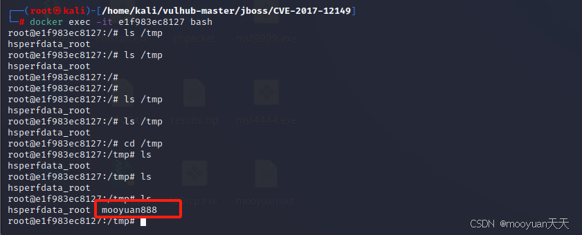 我们尝试执行一个命令,例如 touch /tmp/mooyuan888。如果成功,会在目标服务器的 /tmp 目录下创建一个名为mooyuan888的文件,这是漏洞利用成功的标志。我们先进入容器,查看下/tmp下文件,如下所示不存在mooyuan888这个文件。