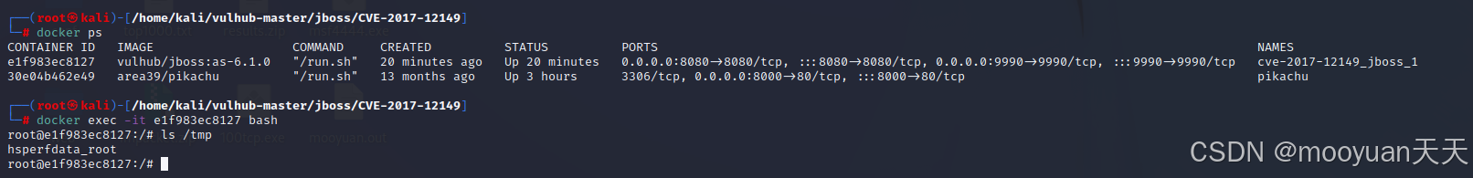 使用 docker ps 命令确认容器启动状态,如下所示当前运行的容器e1f983ec8127属于 Vulhub 搭建的CVE-2017-12149漏洞复现环境(容器名均为CVE-2017-12149)。