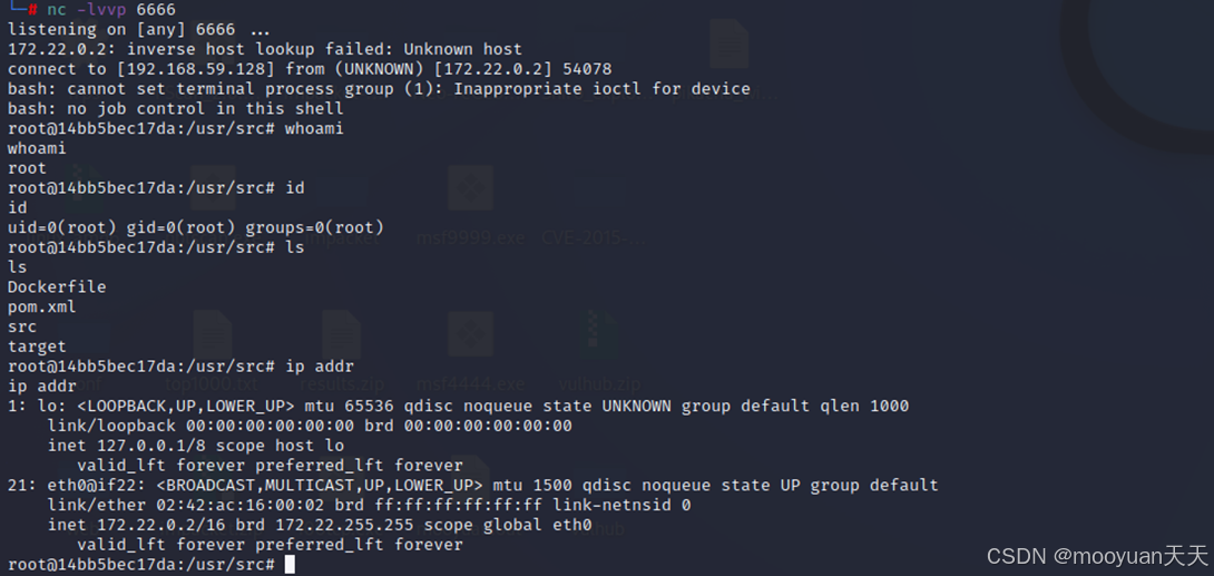 此时查看kali攻击机的监听,已经成功连接,输入whoami、ip addr返回正确结果,渗透成功。此时观察反弹的shell的容器id为14bb5bec17da,正好是我们创建的Docker漏洞环境。