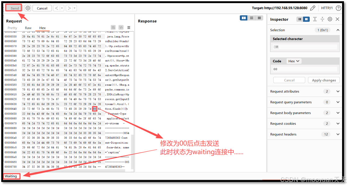 当修改为00点击发送后,可以看到此时这个请求一直处于waiting中,也就是正在连接中状态。