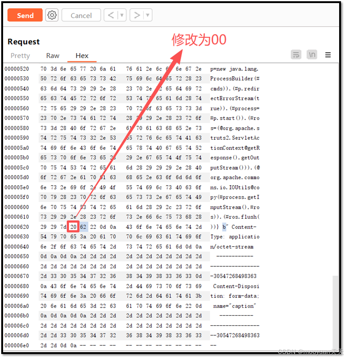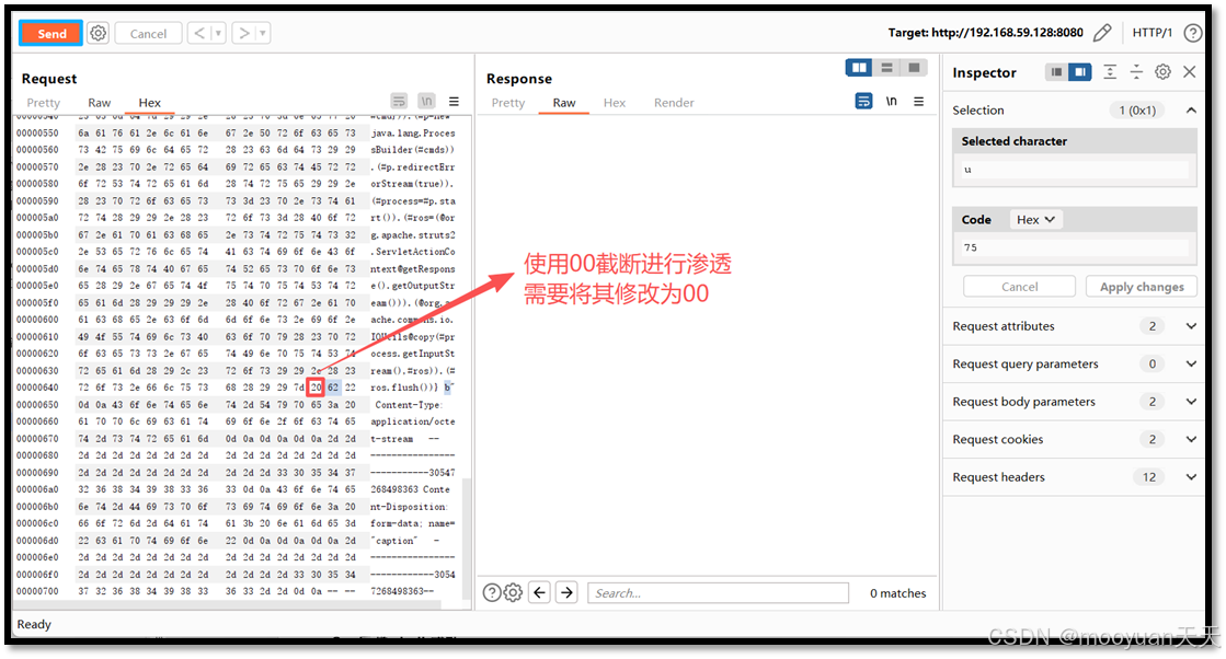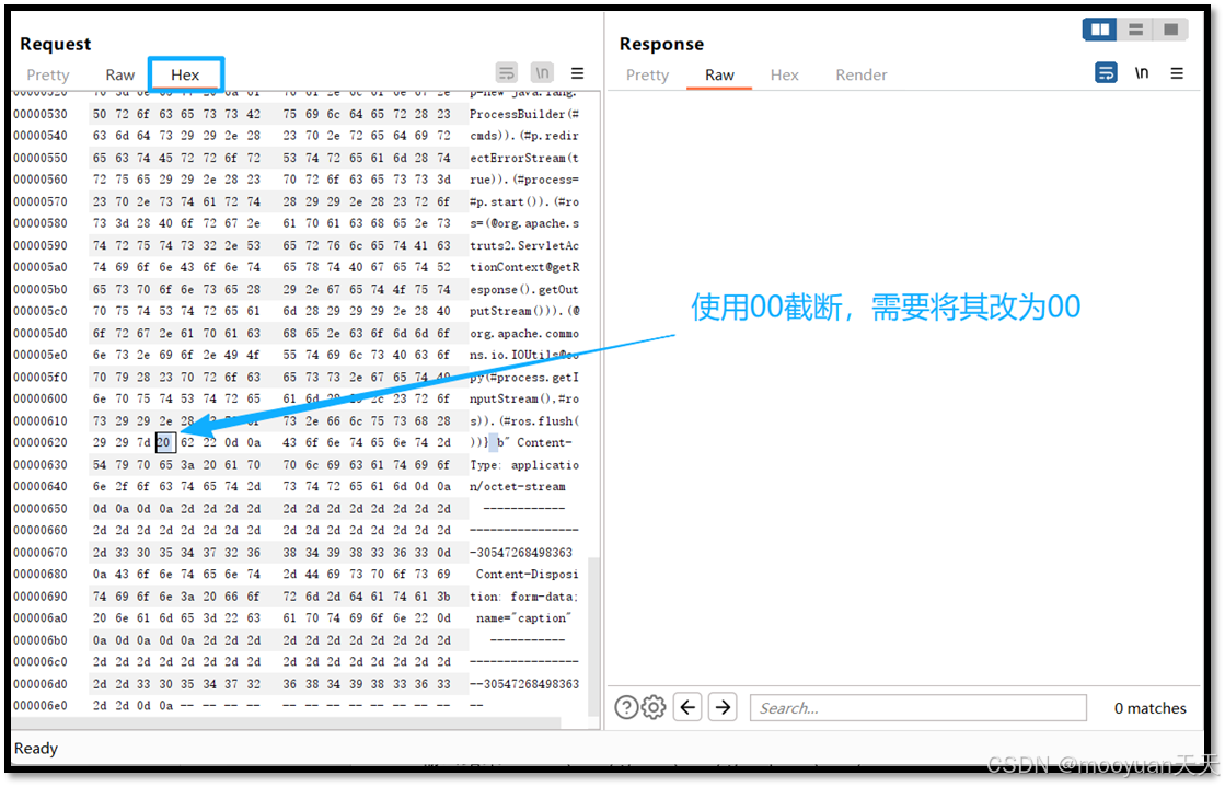 接下来选择使用hex显示request报文,使用00截断法修改请求报文(b在hex中是62,找到62前面的一个改成00即可)。