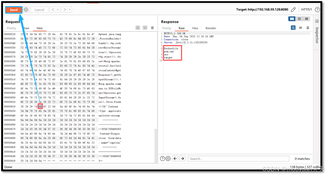 双击上图红框中的62前面的20,将其改为00,修改后如下所示,点击发送请求,开启ls命令执行的攻击。如下所示,输出结果为: