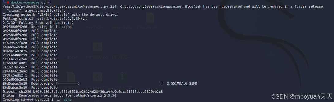 在struts/S2-046目录下,使用docker-compose up -d命令启动环境。Vulhub 的脚本会自动从 Docker Hub 拉取预先构建好的镜像并启动容器。