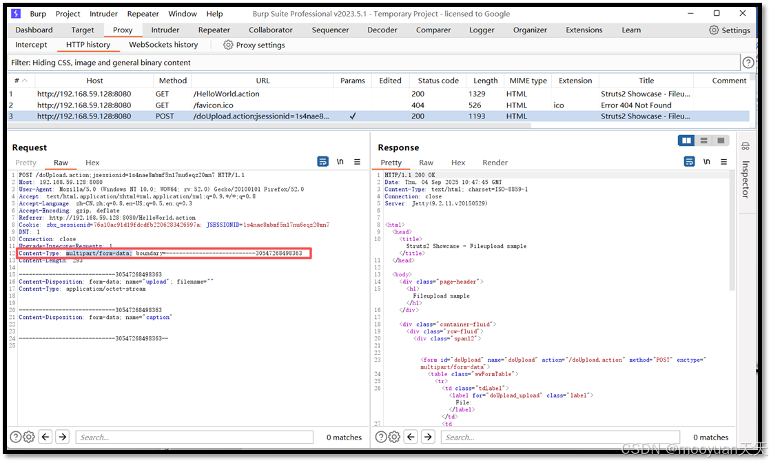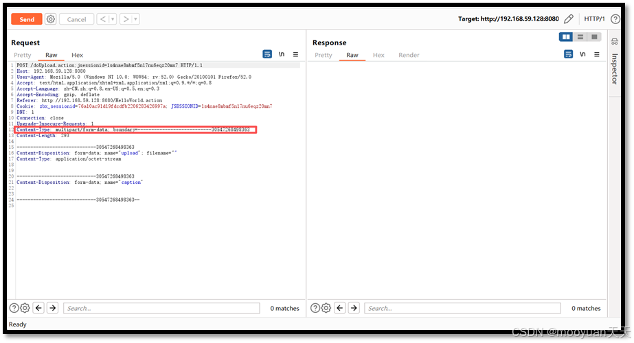 点击上传,burpsuite抓包,如下所示,红框的内容就是我们要修改的部分,为便于修改,右键将报文发送到repeater。