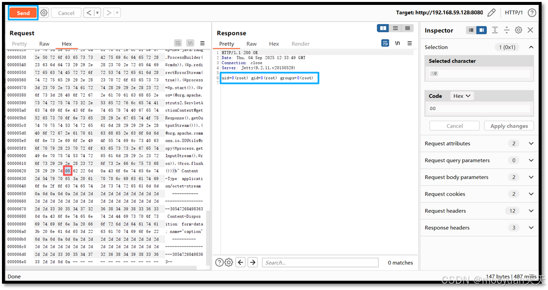 双击上图62前面的20,将其改为00,修改后如下所示,点击发送请求,开启id命令执行的攻击。如下所示,输出结果为 uid=0(root) gid=0(root) groups=0(root)。