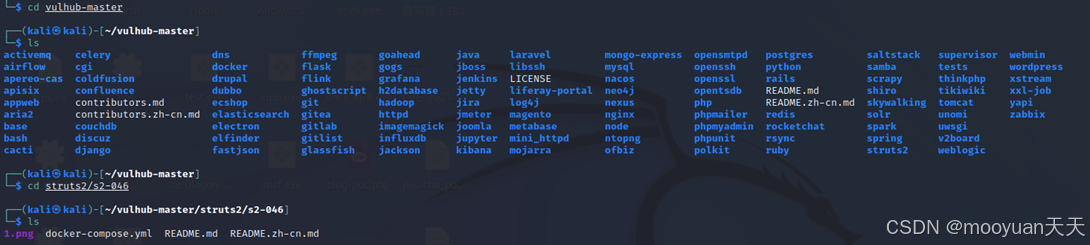 Vulhub 已经准备好现成的漏洞环境,我们只需进入对应目录。注意:docker需要管理员权限运行,故而注意需要切换到root执行后续的docker命令。