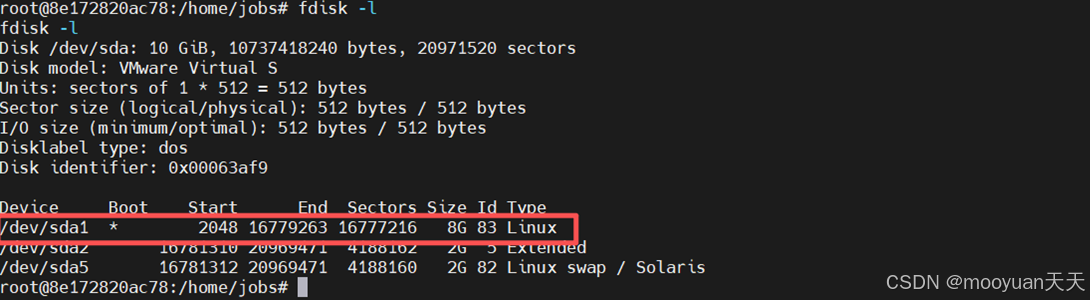 使用fdisk -l快速查看系统中有哪些磁盘和分区,这是因为攻击者在容器内执行 fdisk -l。由于容器运行在特权模式下,它能够直接看到宿主机的物理磁盘设备。通过fdisk -l获知宿主机磁盘为/dev/sda。