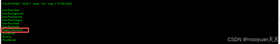 我们来进行PATH环境变量劫持提权攻击,我们通过find命令获知/home/jobs/shell 是一个设置了SUID权限位的可执行程序,具体步骤如下所示。