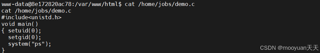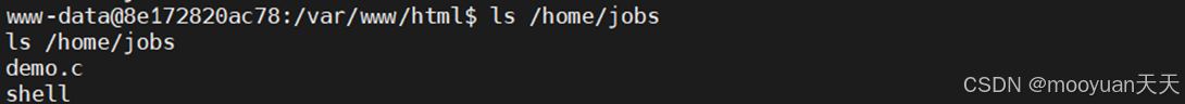 由于/home/jobs/shell是可执行文件,我们尝试进入到其文件目录,看看是否有什么信息可以利用。首先使用命令ls -l /home/jobs检查目录是否存在相关源码文件,发现 demo.c 文件。