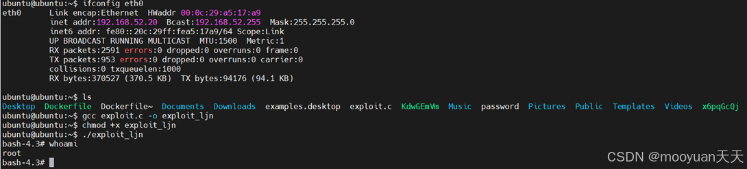 首先使用GCC编译器将名为exploit.c的C语言源代码编译为名为exploit_ljn的可执行文件,随后通过chmod命令为其添加可执行权限,最终运行该漏洞利用程序,通过执行内核级漏洞利用代码实现从普通用户到root权限的本地提权。