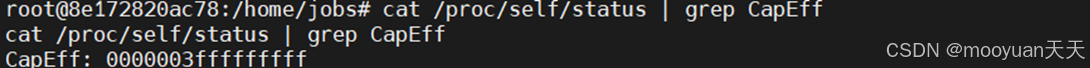 通过cat /proc/self/status | grep CapEff查看能力值,若返回值为 0000003fffffffff 等接近全权限的掩码,则确认容器以特权模式运行。如下所示说明存在特权模式启动docker的问题。