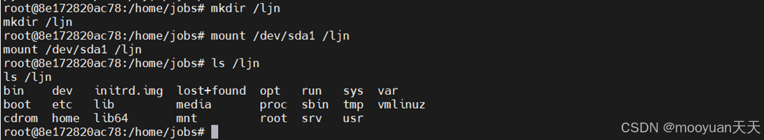 确认特权模式后,在容器内创建临时目录作为挂载点( /ljn)。使用 mount 命令将宿主机的物理磁盘(如 /dev/sda1 )挂载到该目录。此操作成功的关键在于特权模式绕过了设备访问限制,使得容器能够直接访问宿主机的存储设备,从而建立起从容器到主机文件系统的桥梁。