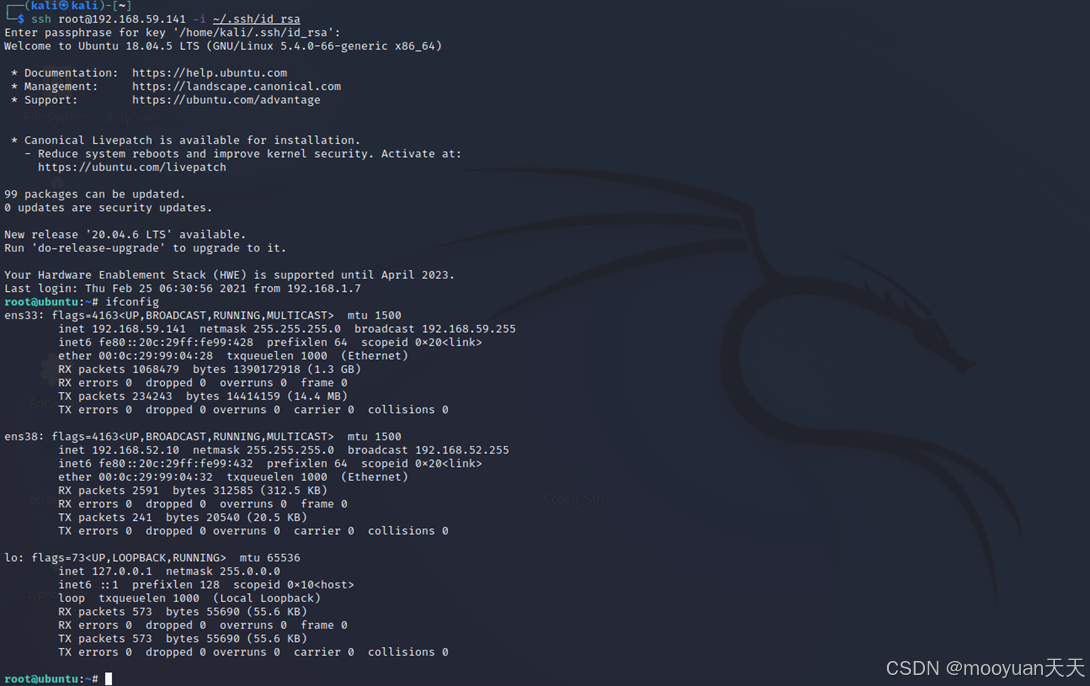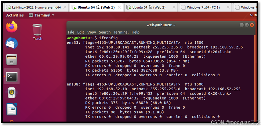 - DMZ跳板机:Web1(Ubuntu):Vmnet8-192.168.59.141 Vmnet2网卡:192.168.52.10