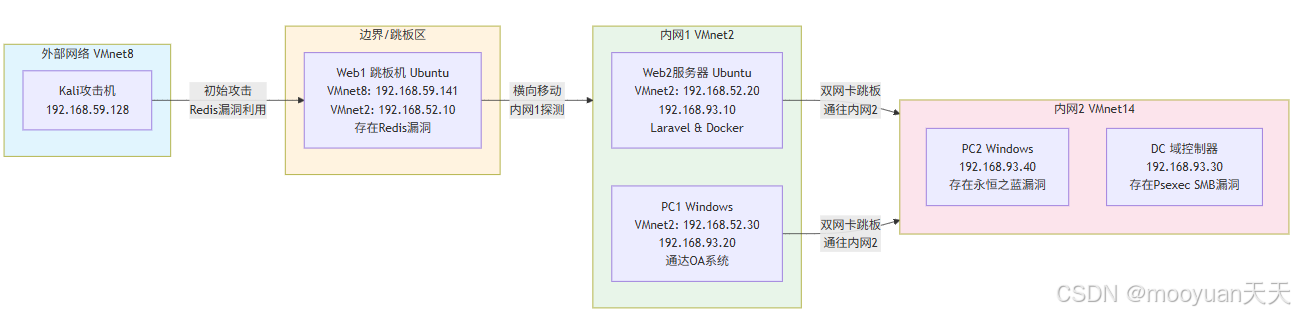 | DC (目标) | 192.168.93.30 (Vmnet14) | 域控制器,存在Psexec/SMB漏洞 | 内网2最终攻击目标 |