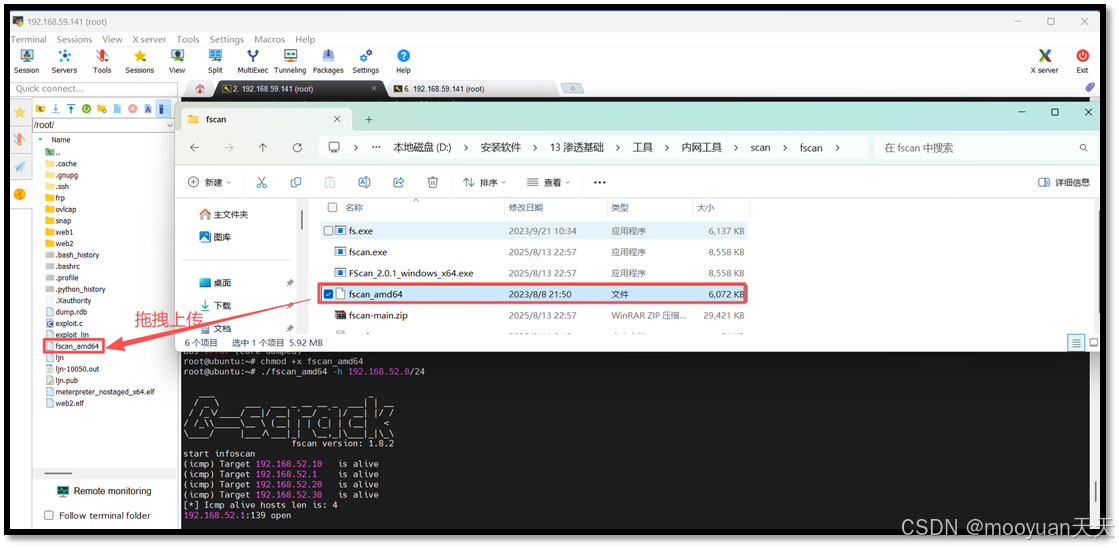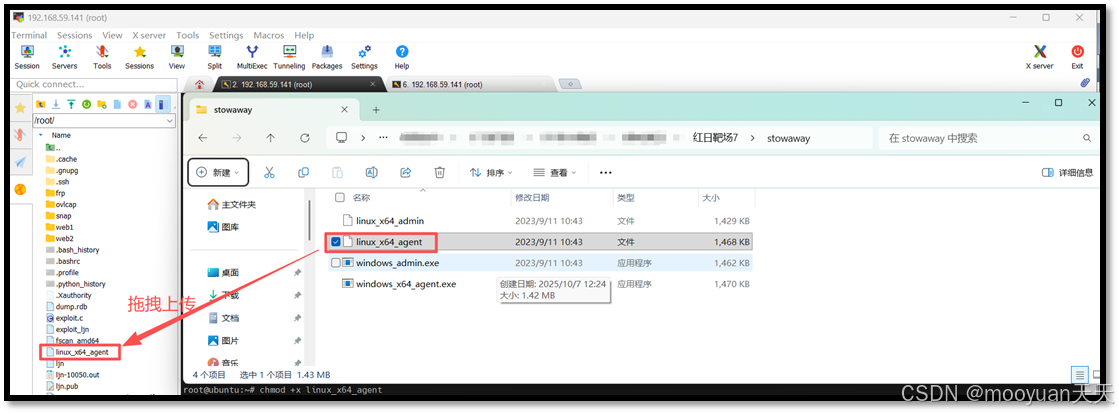 由于Web1服务器是Linux系统,故而需要将fscan_arm64传入到Web1中,我们直接将其拖拽到xterminal的左侧目录即可,具体操作步骤如下所示。
