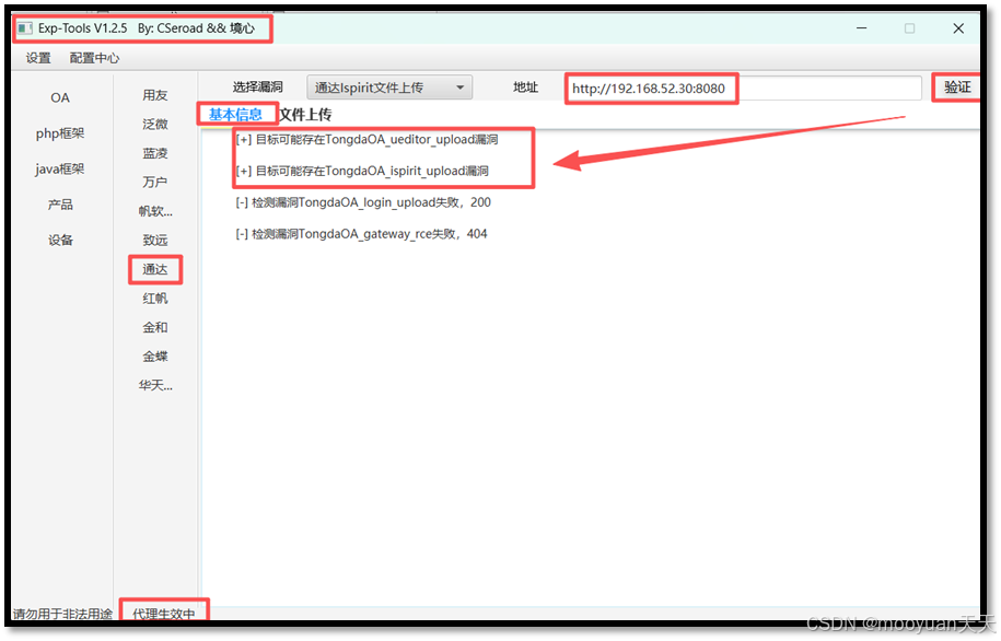 左侧的菜单栏中选择通达(如下图左侧红框所示),在地址栏输入Fscan中扫描到的通达OA服务URL地址http://192.168.52.30:8080/,点击验证如下所示存在文件上传安全风险。