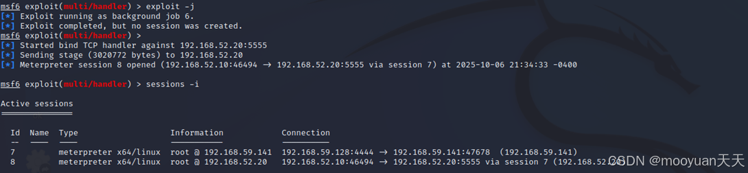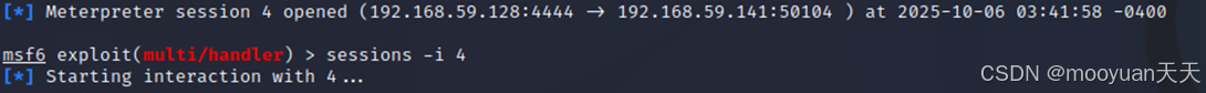 回到kali攻击机的MSF监听页面,此时已经监听成功。