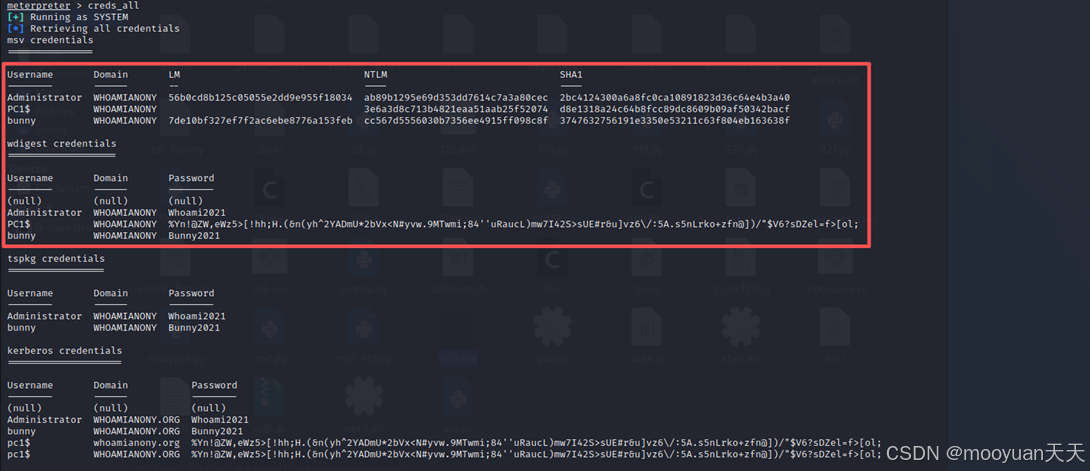 如下所示,Meterpreter命令成功以SYSTEM权限提取了目标主机的全部认证凭据,完整获取了WHOAMIANONY域(或WHOAMIANONY.ORG)中Administrator用户(密码Whoami2021)、bunny用户(密码Bunny2021)的明文密码及NTLM哈希,同时捕获了计算机账户PC1$的机器密码哈希,为后续横向移动和权限维持提供了完整的凭据集合。