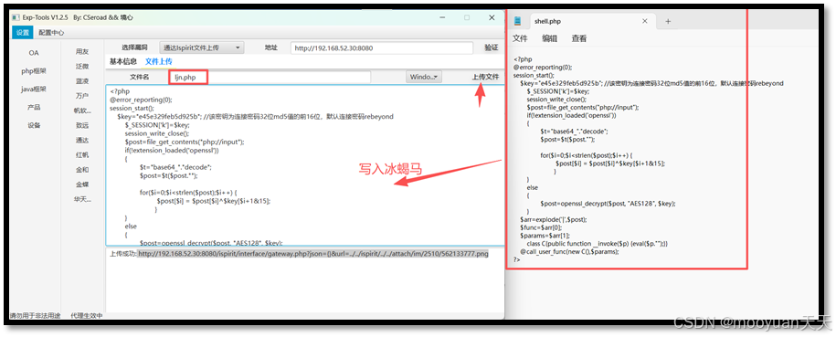 接下来我们点击“文件上传”,在文本框内粘贴冰蝎马的内容,并点击上传文件,如下所示成功上传冰蝎马。