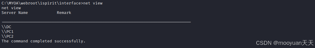 执行net view列出当前域或工作组中可用的网络计算机,分别为DC、PC1和PC2。